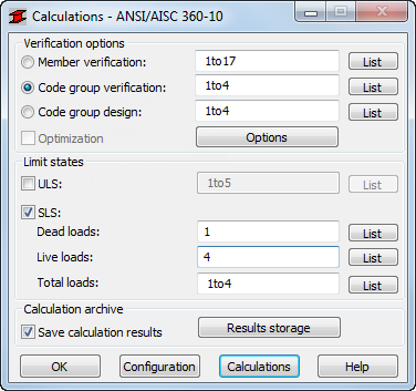 3. In the Limit states group of options select SLS, in order to perform calculations for the service limit state, and then type the following loads: