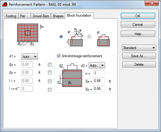 If the Block foundation option is selected in the Dimensions Definition dialog (Lean concrete/Block foundation tab), the Reinforcement Pattern dialog includes options used to determine parameters of the reinforcement connecting the foundation with the block foundation.