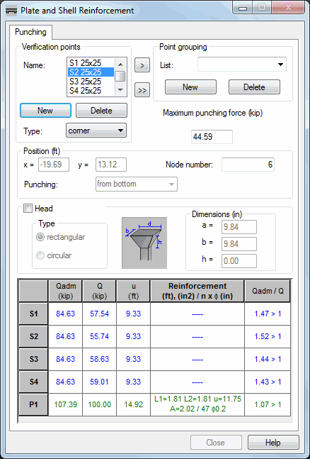 In the punching analysis for each verification point table, the following values are presented.