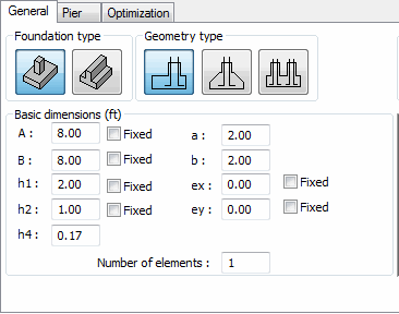 The General tab allows you to define the foundation type and its basic dimensions.