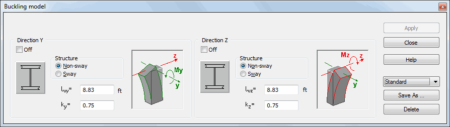 The program allows saving defined parameters of a buckling model in the form of a set of parameters, and then using it to ensure faster definition of a buckling model in successive structure elements. To save a parameter set (or modify the predefined Standard set), after setting selected model parameters the user should press the Save As button in the above dialog box and specify a name of a new set. A set will be added to the list of buckling models. To remove a set from the list, the user should select it on the available list and press the Delete button.