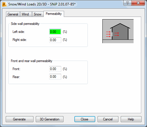 Opening the Snow/Wind Load dialog and clicking the Permeability tab displays the following dialog.