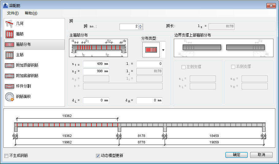 箍筋分布的分区是针对每个跨分别定义的。沿梁长度的箍筋分布参数包括: