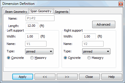 The Fix span length in axis option (the option is active for beams defined directly in the RC beam module) determines if a change of the support width has effect on the span length, if the length remains constant when the width changes.