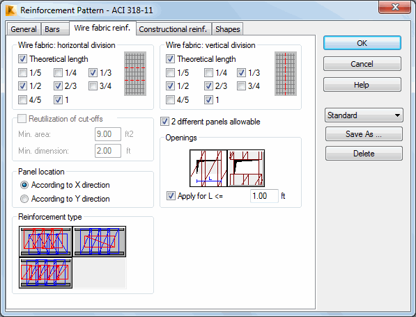 Wire fabric: horizontal division and vertical division independently selects the manner of cutting wire-fabric sheets for horizontal and vertical reinforcement. Modular cutting of wire-fabric sheet obtains patterns that will use the entire sheet, reducing further work.