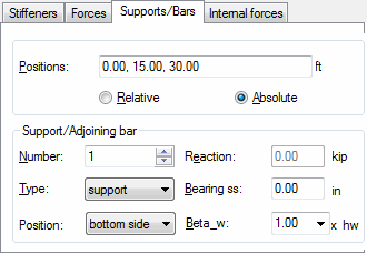 If a concentrated force, originating in a reaction or an adjoining bar, is not transmitted locally (at a point) to the beam, but it is applied over a certain length the length is defined in the Bearing ss field.