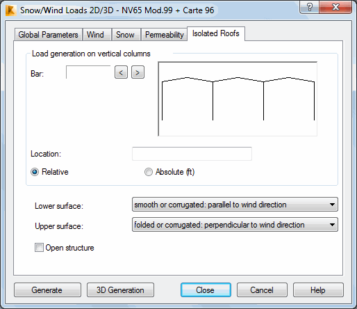 Opening the Snow/Wind Load dialog and clicking the Isolated Roofs tab displays the following dialog.