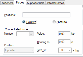 In automatic mode, you cannot change the position of load application along an element, or modify its value. Therefore, the Positions and Value fields are inactive. You can only change the information concerning the bearing width (Bearing ss field) and the position with respect to beam height (Position field).
