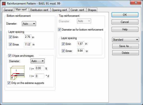 Bottom reinforcement - Determines the diameter of reinforcement, define the minimum and maximum spacing between reinforcement layers.