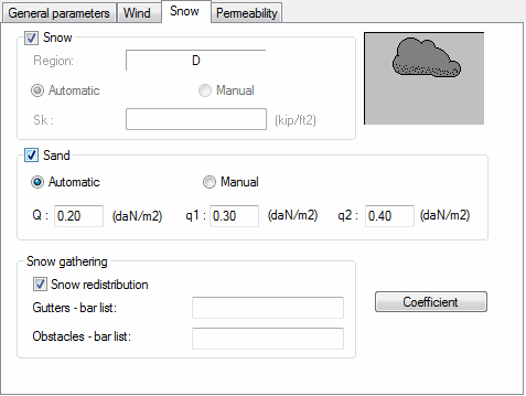 The dialog is divided into several fields with groups of specific options. The top of the dialog has the options for snow loads. When the Snow option is selected, a snow load is generated.