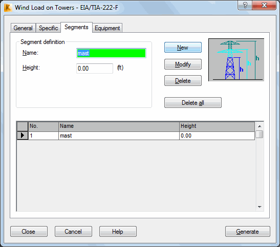 Opening the Wind Load on Towers dialog and clicking the Segments tab displays the following dialog.