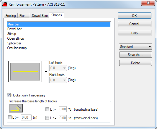 Specify the shape for the following bars: Main bar, Dowel bar, Stirrup, Open stirrup, Splice bar, Circular stirrup.