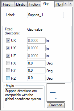 The definition of support with gap consists in indicating the support name, selecting the fixed or released degrees of freedom and indicating the values of the allowable displacement or rotation for the released directions. If the direction is fixed, the displacement is equal to zero.