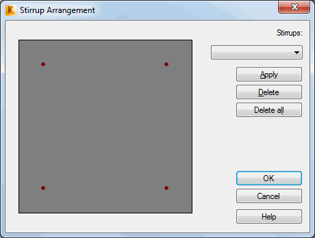 To define a stirrup with the required shape, one should click the successive longitudinal bars with the left mouse button. The operation defines the shape and arrangement of transversal reinforcement. The determined stirrups should have the shapes of closed figures. A pin or shackle is symbolized by a straight segment connecting two longitudinal bars. Pressing the Apply button after every stirrup definition results in accepting the definition of the stirrup shape. Once the shape is defined and changes accepted, the defined stirrup shape is displayed in the figure representing the cross-section of the column.