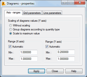 The following dialog is displayed after the Axis - ranges tab is selected in the Diagrams - properties dialog.
