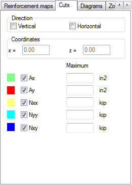 The tab selects the direction of a cut (vertical or horizontal) and a value to be presented on a cut. The values available include Reinforcement in X or Y direction (horizontal and vertical) denoted Ax and Ay as well as internal forces in directions X and Y (horizontal and vertical), and also tangent lines XY denoted Nxx, Nyy and Nxy, respectively.