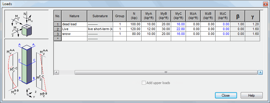 Column loads can be defined in the above dialog box. Depending on the calculation options selected, the user may define either only the compression force (the case of the column axial compression) or the compression force, moments (the case of the column compression and bending) and shear forces (the case with shear considered). It is also possible to automatically add upper loads. If the option Add loads from the upper column is selected (√ appears on the screen) loads from the upper column are added to the loads of the current column. Added loads are saved in the first rows of the column load worksheet and cannot be edited. When the option is deselected, upper column loads are skipped during column design process.