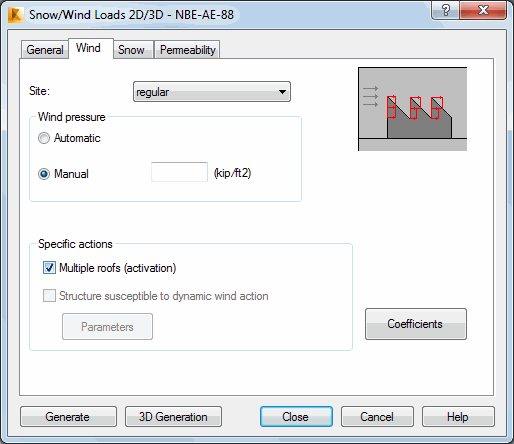 Opening the Snow/Wind Load dialog and clicking the Wind tab displays the following dialog.