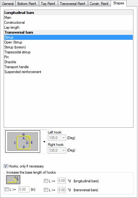 Options in this dialog let you select shapes of the longitudinal and transversal reinforcement. For cross bars, the pin or stirrup shape is selected. For transversal bars you can select a preferred shape of a stirrup, pin or transport handle. The longitudinal bar shape (ends) are set in a similar way with differentiation between main and structure bars. You can select the end type for each end of the bar in the shape of a hook, bent at any angle.