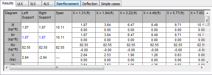 The tab is made up of a table in which the numeric values of the items selected for presentation may be chosen. The content of the table is related to the category of the results chosen from the scroll list found in the lower part of the dialog box as well as to the selection of the active span (in the case of a multi-span beam). The kind and extent of the displayed results depends also on the settings on the remaining tabs of the Diagrams dialog box.