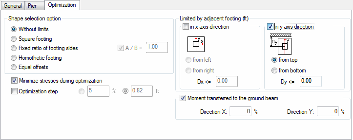 The Optimization tab allows you to define the shape and dimensions of a designed foundation.