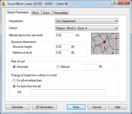 Opening the Snow/Wind Load dialog and clicking the Global Parameters tab displays the following dialog.