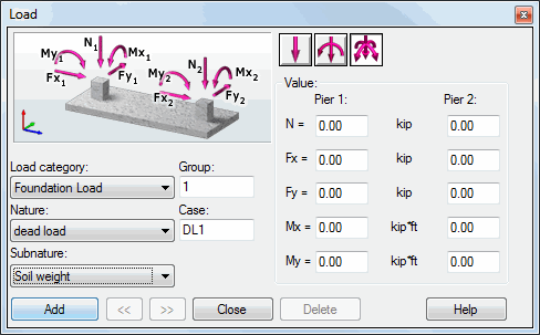 (Load definition) or select RC element > Loads to define the loads applied to a foundation.