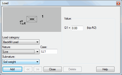 In the case of a backfill load, the value of the load Q1 should be entered. Two natures are available: dead and live.