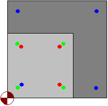 This procedure is illustrated by the drawing below; in the drawing the blue color indicates reinforcing bars of the lower column, bars of the upper column are marked in green, while additional dowel bars are shown in red. The bar positioned in the bottom left corner of the lower column has been bent by the horizontal dimension equal to the diameter of a bar in the upper column.