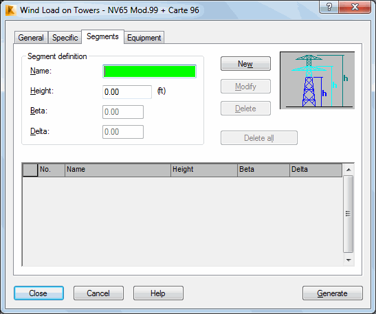 Opening the Wind loads on towers dialog and clicking the Segments tab displays the following dialog.