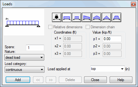 If continuous load type is selected, the Dimension Chain option appears. If this option is active, (the symbol √ appears), a so called dimension chain will be used while defining a continuous load. This signifies that the continuous p2 load value will be applied at a concentrated with the coordinate (x1+x2), the p3 load value at a concentrated with the coordinate (x1+x2+x3) etc.If the option is inactive, the load p1 is applied at a concentrated with the coordinate x1, the load p2 at a concentrated with the coordinate x2 etc.