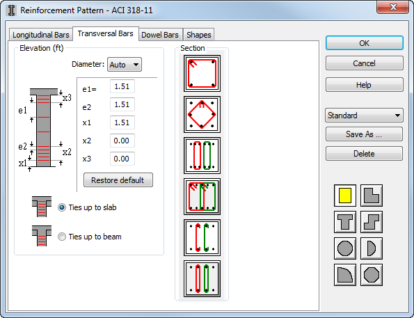 Recommended transversal reinforcement patterns in a section. The pattern list corresponds to the selected column section. According to selected patterns and their sequence, the program will accept the optimum solution.
