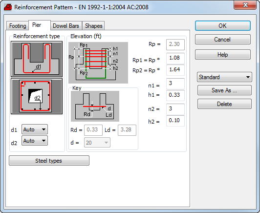 Select the basic reinforcement shapes and diameters of the horizontal and vertical insets. Once the basic reinforcement shape is determined, you can indicate a specific inset shape on the Shapes tab (both vertical - pier reinforcement and a horizontal - a stirrup). If the d1 and d2 diameters are the auto value, the diameters according to the defined spacings and in connection with the operating load are selected.