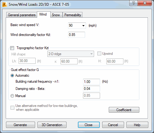 Opening the Snow/Wind Load dialog and clicking the Wind tab displays the following dialog.