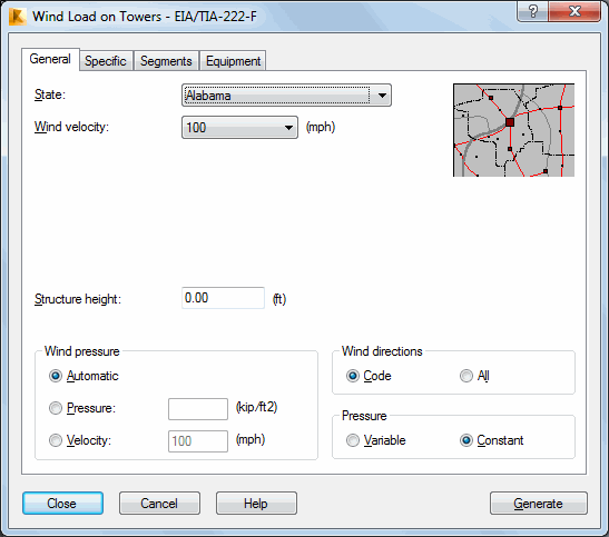 - Wind velocity - Specifies the base wind velocity from the values in the TIA/EIA code for a state.