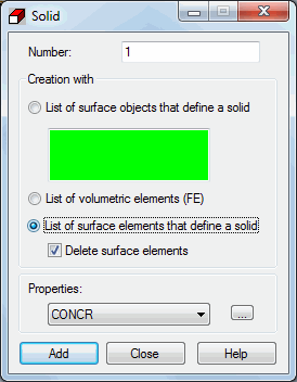 Note: If a solid-like object is created using the Creation with list of volumetric elements (FE) option, the finite elements cannot contain inclusions (that is, a solid cannot include openings). This problem can be solved by creating 2 solids so that neither of them includes the entire opening itself.