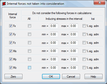 Use this option to determine the limit values of internal forces; thus the force values 'negligible' for a specific section may be disregarded. Access the option by clicking the Exclude internal forces from calculations button in the Configuration dialog.