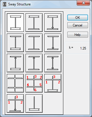 The dialog box shown below allows for the selection of the buckling model for sway structures (analogous dialog box is opened for non-sway structures). It is active once the sway structure option (for Y or Z direction) is selected in the Column Buckling Model Selection dialog box and the icon corresponding to the buckling model is pressed.