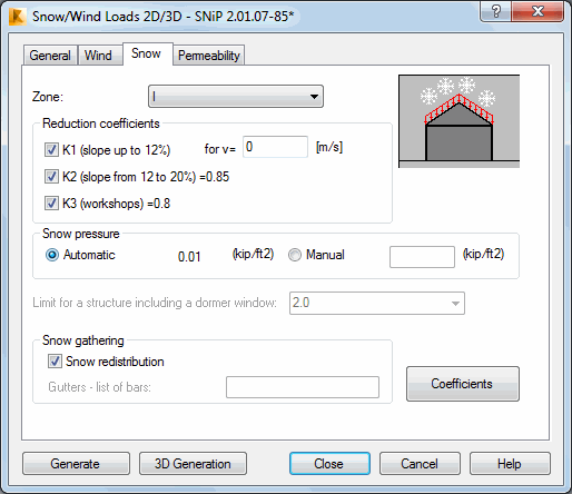Opening the Snow/Wind Load dialog and clicking the Snow tab displays the following dialog.
