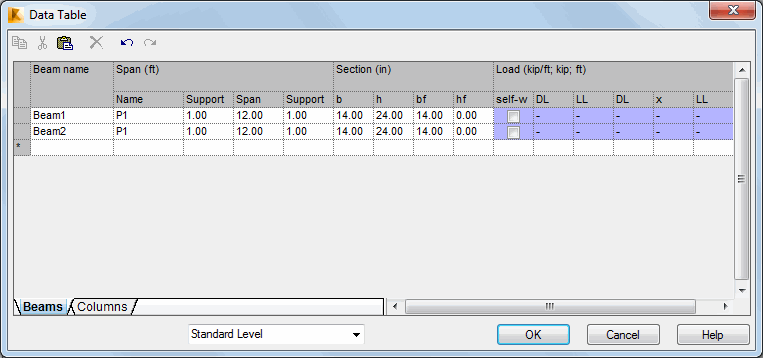 The Data table offers a quick means of defining any number of beam or column elements, accompanied by loads, to be followed by calculations. The dialog is divided into two tabs: Beams and Columns.