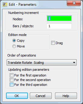 Drag - This option lets you turn on and off dragging during a complex editing operation or transformation of a coordinate system. When selected, Robot creates new bars between the new structure nodes that were created during editing and the original nodes. The bars are numbered automatically.