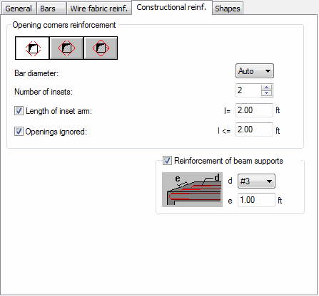 Opening corners reinforcement selects the distribution method for reinforcement of slab openings. The diameter of reinforcing bars and numbers of insets may be selected there.