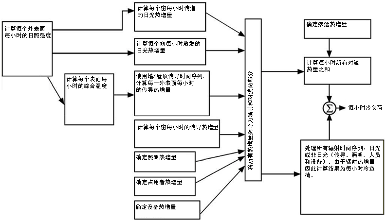 许多热源通过将对流和辐射组合在一起来将能量传递到房间。热增量的对流部分立即成为冷负荷。辐射部分必须首先由房间内表面的面层和体量来吸收,只有在随后通过从这些表面对流到房间空气传热之后才会变为冷负荷。因此,辐射热增量在延迟一段时间之后才会变为冷负荷。