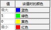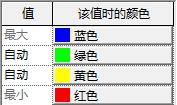 当向默认的最大和最小设置添加新的值颜色对时,自动指定的颜色处于其上和其下颜色的中间(使用 RGB 线性提供)。与“自动”值对应的精确编号根据分析结果而变化,如下表所示: