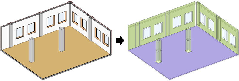 建筑模型无需包含房间图元或空间图元以创建能量模型。构成分析空间和表面的三维几何图形直接从建筑图元生成,独立于二维或三维的房间或空间。