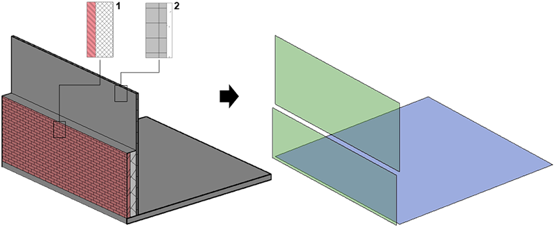 当两个或更多图元处于平行或接近平行状态时,“分析空间分辨率”设置一次或两次后,这些图元会夹在一起。 在这些情况下,将创建适合的单独分析表面。如果单独夹层图元具有材质热属性,则它们将在 gbXML、DOE2 和 EnergyPlus 文件中转换为一组合适的构造、图层和材质数据。