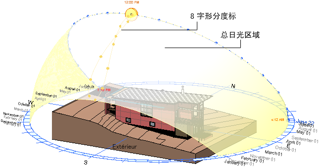 | 8 字形分度标 | 代表一年期间内每天的同一时刻太阳在天空中位置的 8 字形路径。 它在“静止”、“一天”和“多天”模式中可见。 | 将日光垂直于每天路径并沿 8 字形分度标拖曳,可以修改日期。 |
