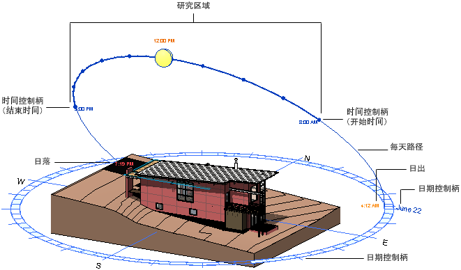 | 每天路径 | 太阳于指定日期在天空中移动所遵循的弧形路径。 它在“静止”、“一天”和“多天”模式中可见。 | “静止”和“一天”模式:沿每天路径拖曳日光可以修改时间,或者拖曳每天路径本身可以修改日期。“多天”模式:拖曳任一每天路径可以修改研究的开始日期或结束日期。 |
