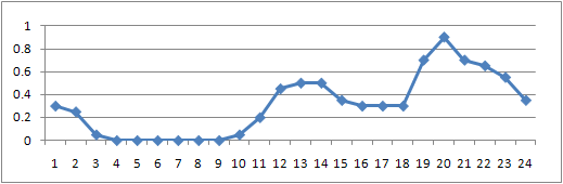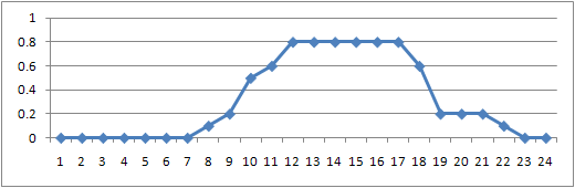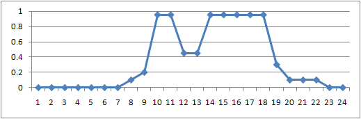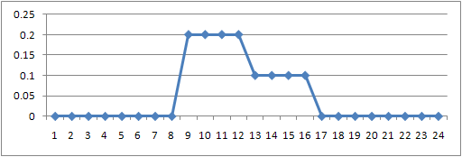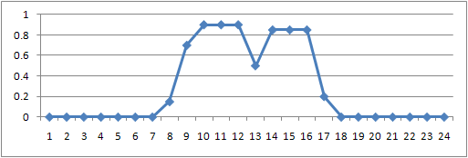 对于每个占用率明细表,以下表格中都将提供 24 小时时间段(从午夜算起,x 轴上的 0 到 24)内每小时的值。这些值(y 轴上的 0 到 1)是小于 1 的乘数。