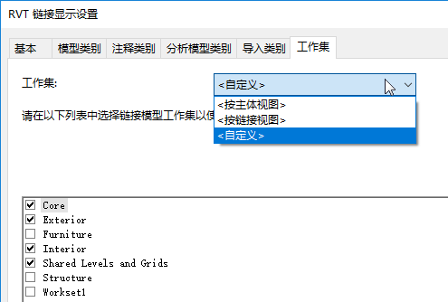 请使用主体模型“RVT 链接显示设置”对话框的“工作集”选项卡。在该选项卡上,可以选择要显示在主体模型某个视图中的特定工作集。